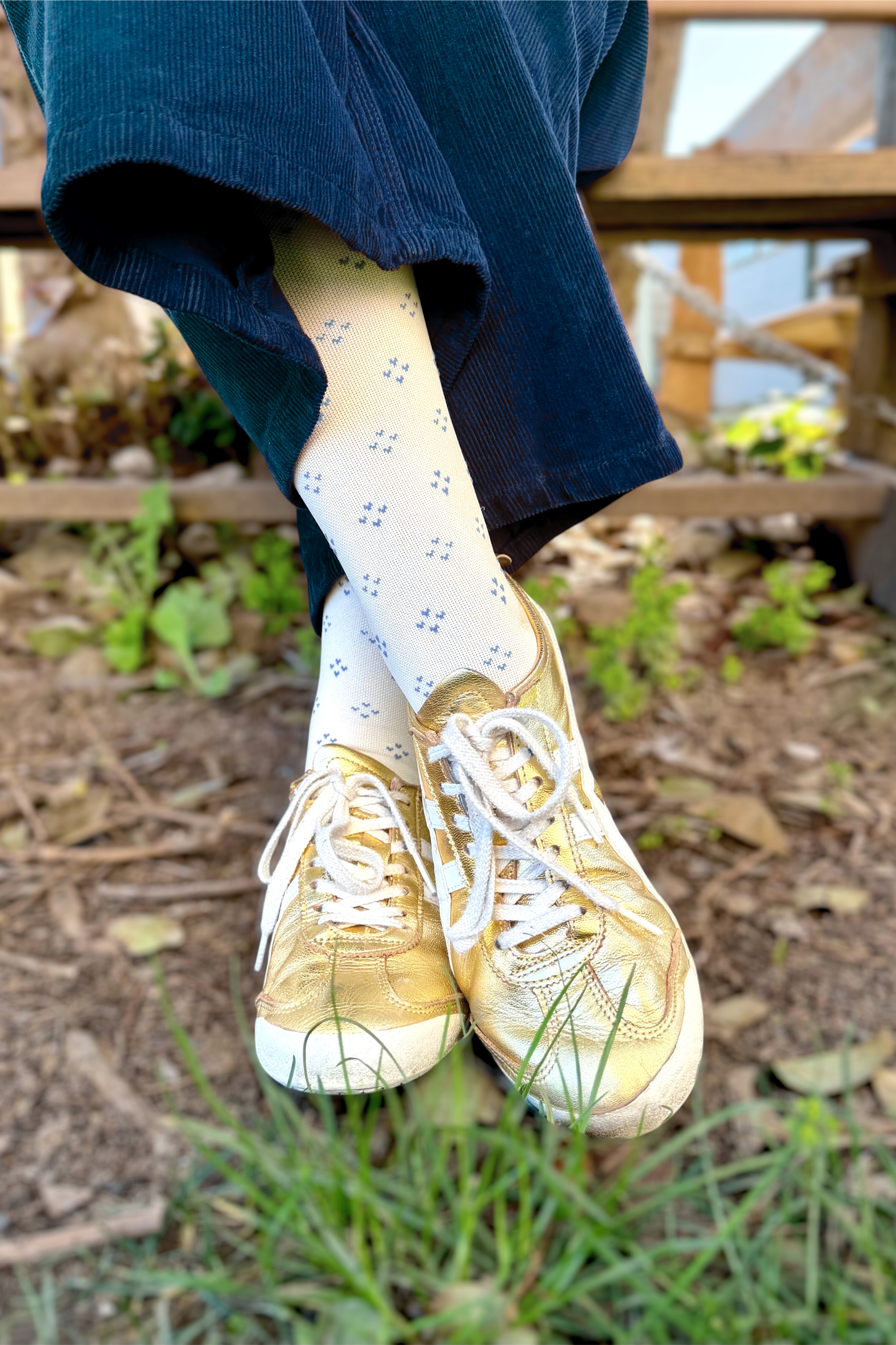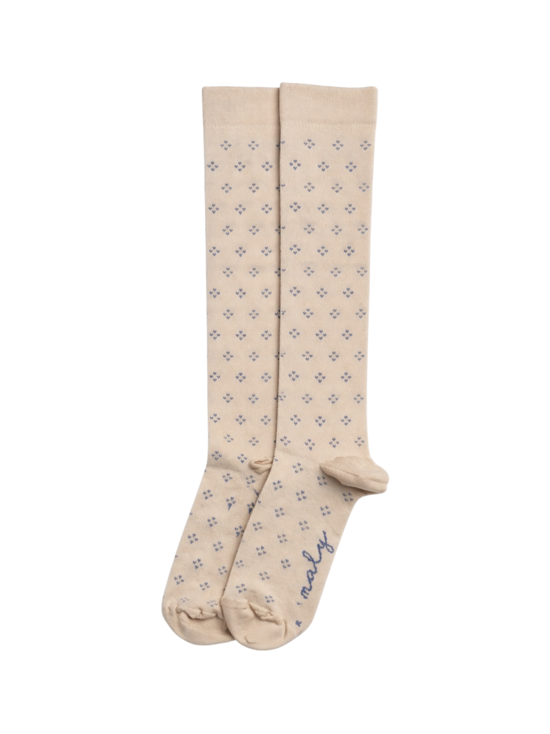 Meias de compressão unissexo até ao joelho com padrão piquet pontilhado em azul e bege.
